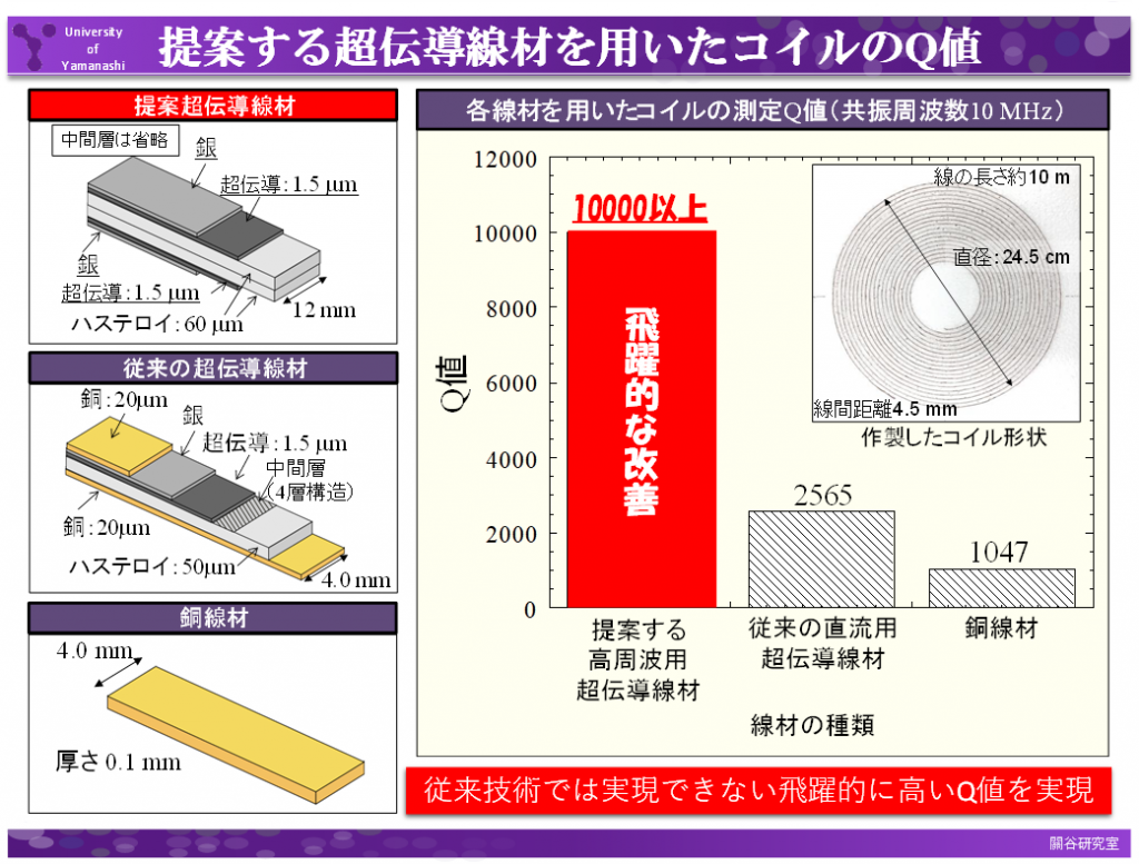 關谷研究室では,近年実用化が進んでいるワイレス電力伝送(WPT)に超伝導体を用いる新しい研究にも取り組んでいます.WPTは携帯電話や家電製品,電気自動車などに非接触で電力を供給する技術であり,電力を供給するためのコイルに低損失の超伝導体を用いれば,非常に効率よく電力を供給できるようになると考えられます.しかしながら,従来の超伝導ケーブルは高周波で低損失を実現することができませんでした.そこで,關谷研究室では高周波でも低損失を実現できる新しい高周波用超伝導ケーブルを開発しました(参考文献[3]).その超伝導ケーブルを使ってコイルを作ると非常に高いQ値(値が高いと損失が小さいことを意味します)を実現できることを実証しました(下図).今後はこの超伝導コイルをワイヤレス電力伝送に使用し,従来技術では実現できない,飛躍的な伝送効率の改善を目指します.この技術をさらに発展させ關谷研究室にしかできないワイヤレス電力伝送の応用を目指します.